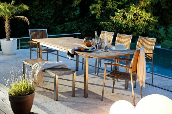 Gartentisch aus Edelstahl und Teakholz mit Synchronauszug auf bis zu ca. 240 cm