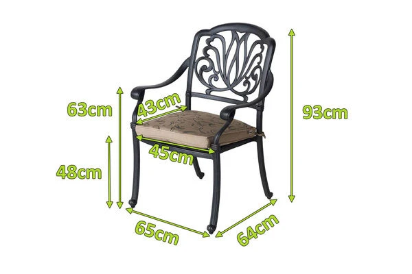Der „Amalfi“ Diningsessel mit Maßen von ca. 64 x 65 x 93 cm (L/B/H) bietet Sitzkomfort und besonderes Design in Einem. Kombiniert wird das romantisch koloniale Design mit dem im Lieferumfang enthaltenen Sitzkissen mit Wendekissenbezug. Hier können Sie selber entscheiden, ob Sie lieber das geblümte Muster mögen oder die unifarbene Seite vorziehen. Durch den Reißverschluss ist das Kissen zudem waschbar und kann durch die Bindekordeln seitlich der Sitzfläche, am Sessel festgemacht werden. Der Sessel ist gefertigt aus hochwertigem Aluminium-Guss, was ihn sehr robust und wetterresistent macht. Dadurch eignet er sich ideal für den Außenbereich und kann unbesorgt das ganze Jahr über im Freien stehen bleiben.