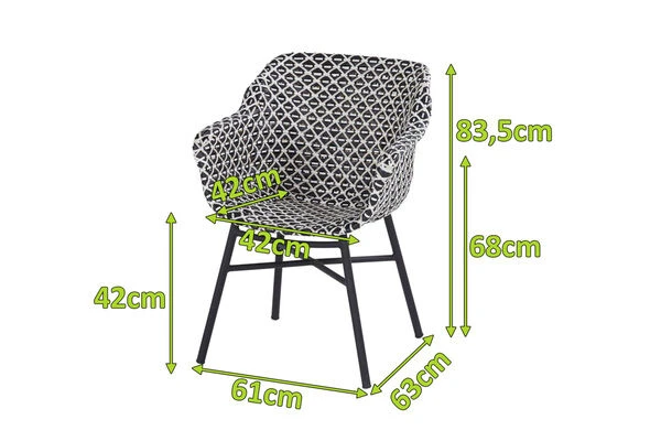 Der „Delphine“ Armlehnensessel mit Maßen von ca. 63 x 61 x 83,5 cm (L/B/H) bietet außerordentlichen Sitzkomfort. Das bequeme, um ein Aluminiumgestell geflochtene Kunststoffgeflecht aus Polypropylen passt sich perfekt Ihrem Körper an und sorgt so für ein rundum angenehmes Sitzgefühl. Armlehnen sorgen dabei für zusätzlichen Komfort und machen das Sitzen zu einem wahren Erlebnis, während die Fußkappen an den Stuhlbeinen unschöne Kratzer auf Ihrem Terrassenboden vermeiden.
