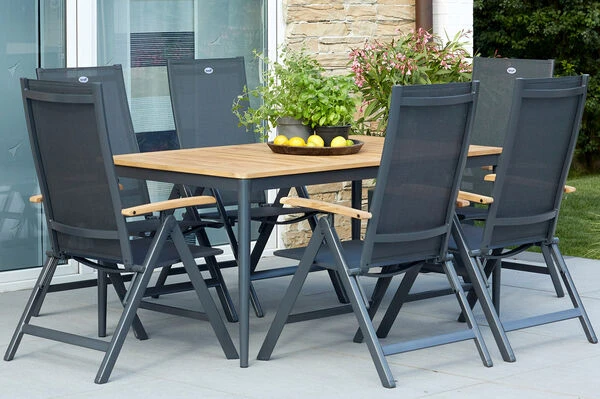 Elegant und zugleich robust präsentiert sich diese extravagante Esstischgruppe von Hartman für 6 Personen. Das Set besteht aus einem rechteckigen Esstisch mit den Maßen von ca. 160/220 x 90 cm und 6 Multipositionssessel aus der „Aruba“-Serie.