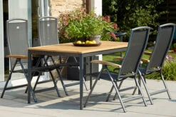 Die schlichte Optik mit dem pulverbeschichteten Aluminiumrahmen in der Farbe Xerix, dem gleichfarbigen Textilen-Gewebe (70% Polyvinylchlorid, 30% Polyester) und den Armlehnen aus edlem FSC®-Teakholz macht dieses Modell dabei zu einem echten Hingucker. Auch funktional überzeugt dieser bequeme Gartensessel: Die Rückenlehne lässt sich kinderleicht in mehreren Stufen verstellen und bietet damit einen hervorragenden Sitzkomfort. Dank des Aluminiumgestells ist der Sessel zudem leicht und einfach zu transportieren.