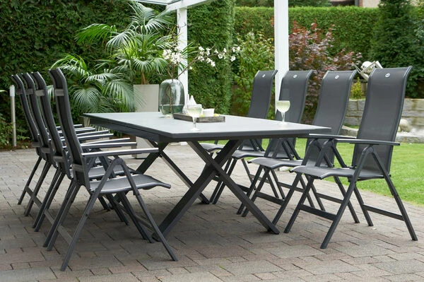 Modern und robust zugleich präsentiert sich diese besondere Esstischgarnitur aus dem Hause Hartman. Das Set besteht aus dem exklusiv bei uns erhältlichen Ausziehtisch Xanadu und 8 Multipositionssesseln Alice Comfort.