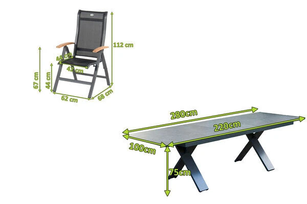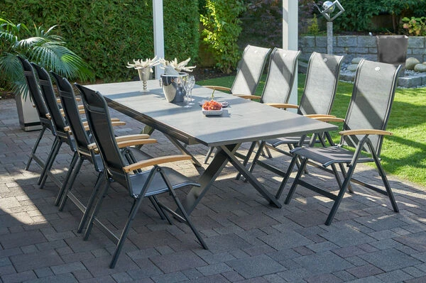 HARTMAN Sondermodell Xanadu / Alice Esstischgarnitur, xerix/schwarz, Alu/Glaskeramik, 4×4 Textilen, 8 Multipos, 220/280x100cm