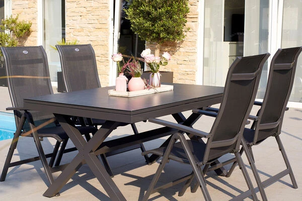 Hartman Esstischgarnitur mit Xanadu Ausziehtisch aus Alu und 4 Multipositionssessel aus der Serie „Alice“