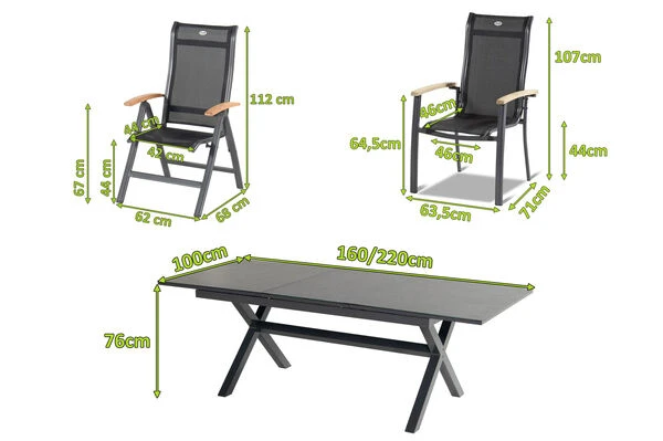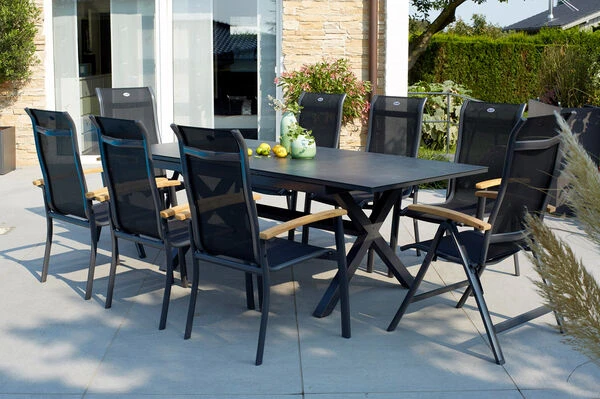 Das gekreuzte Gestell ist gefertigt aus pulverbeschichtetem Aluminium in der Farbe Xerix (Anthrazit) und wird optisch perfekt durch die Glaskeramik-Tischplatte, ebenfalls in der Farbe Xerix ergänzt. Die Maße von ca. 160 x 100 x 75 cm sorgen dafür, dass stets ausreichend Ablagefläche zur Verfügung steht. Bei Bedarf kann der Tisch auf eine Länge von ca. 220 cm ausgezogen werden, so finden bequem auch große Runden genügend Platz in Ihrem Garten. Dank der Ausziehfunktion hebt sich dieses Modell von den üblichen Tischen der Xanadu Serie ab – den Ausziehtisch erhalten Sie exklusiv bei uns.Die verwendeten Materialien sind extrem witterungsbeständig und pflegeleicht, weshalb der Tisch auch bei schlechtem Wetter ohne Probleme auf Ihrer Terrasse stehen bleiben kann. Außerdem ist das Aluminium ziemlich unempfindlich und hält spielend Kälte und Frost stand. Die Tischplatte aus dem Glas-Keramik-Gemisch ist stoß-, schlag- und schnittbeständig und somit ein idealer Begleiter im Familienalltag. Die Trägerplatte ist eine Platte aus Glas, auf die eine dünne Keramikschicht aufgetragen wird.Die Sessel aus der Alice-Serie von Hartman überzeugen durch die qualitative Verarbeitung und die Verwendung ausgesuchter Materialien. Die Armlehnen aus FSC-zertifiziertem Teakholz erzeugen eine unverwechselbare Optik und machen die Stühle zu einem einzigartigen Möbelstück. Das Gestell aus robustem Aluminium sorgt für ein geringes Eigengewicht von ca. 4,3 kg den Multipositionssesseln, sowie 5,3 kg bei einer hohen Stabilität, sodass die Sessel mit bis zu 130 kg belastbar sind. Um Ihren Terassenboden vor Kratzern und Macken zu schützen, verfügen die Füße über praktische Bodenschoner. Dank der vorteilhaften Stoffzusammensetzung der 4×4 Textilenbespannung aus 70% Polyvinylchlorid und 30% Polyester profitieren Sie von einer langen Haltbarkeit. Das flexible Material trotzt spielend den üblichen Witterungseinflüssen, passt sich optimal Ihrem Körper an und macht die Modelreihe auch ohne Auflage sehr bequem.