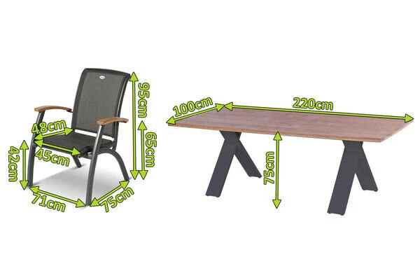 Der Tisch mit dem gekreuzten Gestell ist gefertigt aus pulverbeschichtetem Aluminium in der Farbe Xerix (Anthrazit) und wird optisch perfekt durch die Tischplatte aus SVLK-zertifiziertem Teakholz ergänzt. Die Maße von ca. 220 x 100 x 75 cm sorgen dafür, dass stets ausreichend Ablagefläche zur Verfügung steht und bequem 8 Personen genügend Platz finden.