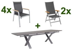Hier erhalten Sie Flexibilität und Komfort in einem stylischen Paket. Die Esstischgarnitur besteht aus einem innovativen Ausziehtisch, 4 Stapelsesseln und 2 Multipositionssesseln. So verwandeln Sie Ihre Terrasse in einen charmanten Wohnbereich im Freien und genießen jeden Tag Urlaubsflair in heimischen Gefilden.