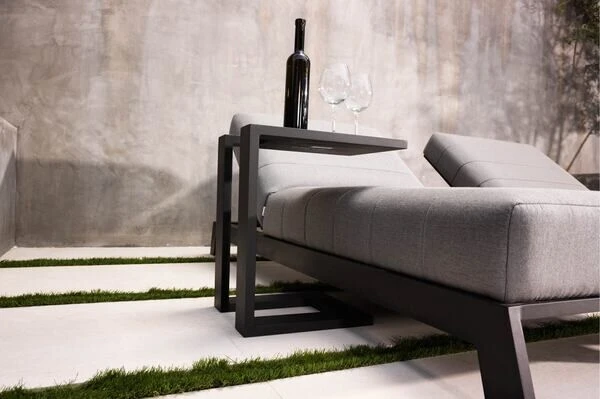 Dieser praktische und stylische Beistelltisch von OUTFLEXX® bietet dank seiner Maße von ca. 48 x 32 x 53 cm genügend Platz für kleine Snacks oder Getränke – so steht einem gemütlichen Mittag mit der Familie nichts im Wege, Sofafeeling inklusive. Besonders praktisch: Dank seiner speziellen Form kann der Tisch auch ganz leicht auf ein Sofa oder eine Liege draufgeschoben werden, so erhält man eine integrierte Ablagefläche. Das Möbelstück besteht aus Aluminium, dies macht es nicht nur stabil, sondern sorgt auch dafür, dass es sich aufgrund des geringen Gewichts von ca. 3,8 kg ganz leicht hin und her stellen lässt. Das Aluminiumgestell wurde mit einer schwarzen Pulverbeschichtung versehen, so ist es besonders wetterfest und passt außerdem wunderbar zu allen möglichen Terrasseneinrichtungen.