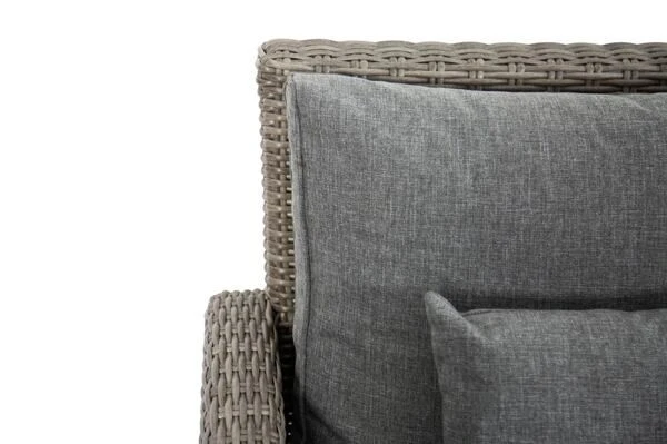 Das Untergestell der Möbel besteht aus pulverbeschichtetem Aluminium, dies macht es nicht nur stabil, sondern sorgt auch dafür, dass es sich aufgrund des relativ geringen Gewichts von insgesamt ca. 68,4 kg ganz leicht hin und her stellen lässt. Das Aluminiumgestell wird mit Polyrattan bespannt. Das halbrunde Geflecht ist in der Farbe grau (Faser w5) gehalten und passt so wunderbar zu allen möglichen Terrasseneinrichtungen. Die gemütlichen Polster (100 % Olefin (200 g/m³)) mit einer Stärke von ca. 10 cm sorgen für höchsten Sitzkomfort. Farblich sind die grau melierten Polster perfekt auf das Geflecht abgestimmt. Die synthetische Faser Olefin wird für ihre Hitzebeständigkeit und optimalen Trage- und Pflegeeigenschaften geschätzt. Sollten Sie einmal Falten in Ihren Polstern haben, werden diese bei Wärme von alleine verschwinden, sodass die Bezüge komplett bügelfrei sind. Textilien aus Olefin sind bequem, hautkühlend, waschbar und bügelfrei. Sie eignen sich perfekt für den Einsatz im Freien, was nicht zuletzt an ihrer wasserabweisenden und atmungsaktiven Materialzusammensetzung liegt.