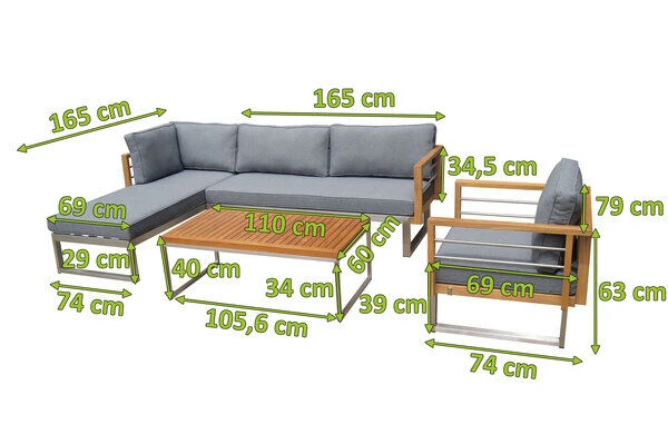 Gönnen Sie sich zu zweit eine Auszeit und legen Sie Ihre Beine hoch oder genießen Sie mit Familie und Freunden den Garten in entspannter Atmosphäre – diese Ecklounge ist Ihr zuverlässiger Partner für angenehme Stunden im Freien. Sie erhalten harmonisch aufeinander abgestimmte Möbelstücke, die zusammen einen einheitlichen Wohlfühlbereich bilden. Die Ecklounge besteht aus einem 2-Sitzer Sofa, einem Sun Lounger, einem Sessel und einem Kaffeetisch. Das 2-Sitzer Sofa wiegt ca. 30,46 kg und verfügt über eine schicke Armlehne auf der linken Seite. Auch der Sun Lounger kommt mit einer Armlehne, die Sie zudem variabel auf der rechten oder linken Seite anbringen können, wenn Sie die beiden Sitzmöbel einmal getrennt aufstellen möchten. Bei einem Gewicht von ca. 27,58 kg ist der Sun Lounger ebenfalls stabil und wertig. Mit Maßen von ca. 165 x 74 x 63,5 cm bieten Ihnen sowohl Sofa als auch Lounger eine großzügige Sitzbreite von jeweils ca. 160 cm. Der schicke ca. 79 x 74 x 63,5 cm große Sessel wiegt ca. 19,87 kg und verfügt über eine Sitzbreite von ca. 69 cm, die einer weiteren Person als eine bequeme Sitzgelegenheit dient. Die Armlehnen sind nicht nur optisch ein Highlight, sie erhöhen auch merklich den Sitzkomfort. Dank einer Sitztiefe von ca. 69 cm und einer Sitzhöhe von ca. 29 cm haben Sie genug Platz, um es sich so richtig gut gehen zu lassen und gemütlich zu verweilen. Selbstverständlich dürfen auch die passenden Polster nicht fehlen. Die ca. 10 cm dicken Kissen verfügen über einen Bezug aus hochwertigem Olefin in der neuen Trendfarbe „grau-schwarz“. Sie sorgen für noch mehr Wohlbefinden und laden jederzeit zu einem kleinen Nickerchen ein. Die schlichten und zugleich markanten Rücken- und Armlehnen bestehen aus hautschmeichelndem Teakholz, das den Sitzmöbeln Halt, Komfort und einen einmaligen Charme verleiht. Machen Sie die Ecklounge zum Mittelpunkt Ihres Outdoor-Bereiches!