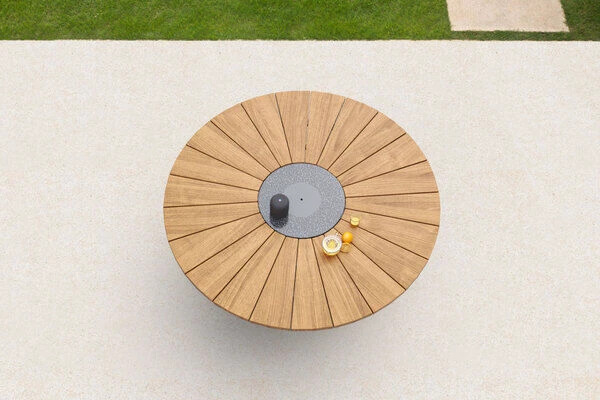 Die Besonderheit dieses Tisches liegt in der Funktionalität der Tischplatte, welche aus mehreren Komponenten besteht und für ein hohes Maß an Komfort sorgt. Die ca. Ø 170 cm große FSC®-zertifizierte Teakholztischplatte spendet genügend Platz für Teller, Gläser oder was sonst noch zu einem gemütlichen Grillabend mit der Familie gehört. Gewürze und Grillsoßen können auf dem ca. 46 cm breiten Granitring abgestellt werden. Dieser kann praktischerweise gedreht werden, sodass schwere Sachen nun nicht mehr quer über den Tisch gereicht werden müssen, sondern einfach und bequem zur anderen Seite des Tisches gedreht werden können. Ein weiteres Highlight finden Sie in der Mitte der Tischplatte – eine eingefasste, herausnehmbare Edelstahlplatte (ca. Ø 25 cm) kann bei Bedarf herausgenommen und durch den im Lieferumfang enthaltenen Eiskühler (ca. Ø 27 cm) ersetzt werden. So haben Sie ab sofort stets ein kühles Getränk zur Hand ohne dabei die gemütliche Runde verlassen zu müssen.