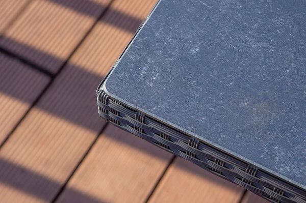 Das Untergestell des Möbelstücks besteht aus Aluminium, dies macht es nicht nur stabil, sondern sorgt auch dafür, dass es sich aufgrund des relativ geringen Gewichts ganz leicht hin und her stellen lässt. Dazu sorgt die Pulverbeschichtung auf dem Aluminium für eine verbesserte Korrosionsbeständigkeit. Das Aluminiumgestell wird mit Polyrattangeflecht bespannt. Das flache Geflecht ist in der Farbe schwarz (Faser w1) gehalten und passt so wunderbar zu allen möglichen Terrasseneinrichtungen.