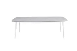 Die hochwertigen Materialien, das edle Design und die praktische Handhabung bringen Ihnen Freude bei jeder Nutzung Ihrer neuen Gartenmöbel. Die Farb- und Materialkombination aus Weiß mit grauen Akzenten schafft eine wandelbare Grundlage, welche die vielfältige Kombination mit anderen Möbelstücken oder Dekoration ermöglicht. Der Tisch kommt mit Maßen von ca. 220 x 100 x 75 cm daher. Mit Platz für bis zu acht Personen können Sie die ganze Familie auf gemütliche Grill- und Spieleabende einladen und das schöne Wetter mit Ihren Liebsten genießen. Die ca. 8 mm dicke Glasplatte in Keramikoptik, die ovalen Formen sowie die nach unten hin schmaler werdenden Tischbeine verleihen diesem Dining Tisch Eleganz und Individualität. Das rostfreie, pulverbeschichtete Aluminiumgestell sorgt für ein geringes Gewicht, damit Sie Ihre Möbel mit Leichtigkeit umstellen können und die weißen Fußkappen schützen dabei Ihren Boden.
