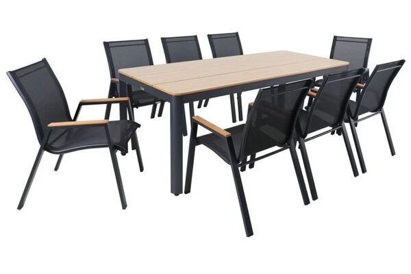 Das Set besteht aus einem Gartentisch mit rechteckiger Tischplatte und 8 optisch übereinstimmenden Stapelstühlen. Das Gestell des Tisches und die Stühle bestehen aus pulverbeschichtetem Aluminium und sind durch die Farbe anthrazit matt zeitlos schön. Aluminium ist ein gern und oft verwendetes Material beim Bau von Gartenmöbeln, da es eine hohe Stabilität und Langlebigkeit aufweist. Zudem ist es ein leichtes Material, besitzt eine gute Korrosionsbeständigkeit und ist witterungsbeständig. Die Pulverbeschichtung verbessert zusätzlich die Stoß-, Schlag- und Kratzfestigkeit des Materials und verleiht dem Aluminium einen dauerhaften Korrosionsschutz und eine anhaltende Korrosionsbeständigkeit. So ist der ganzjährige Aufenthalt im Freien für diese Esstischgruppe überhaupt kein Problem!