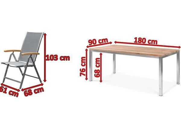 Wenn Sie sich jetzt angesprochen fühlen, sollten Sie sich diese Esstischgarnitur noch genauer anschauen. Das Set besteht aus einem Esstisch mit den Maßen von ca. 180 x 90 x 76 cm und 6 Multipositionssesseln aus einer Teak/Edelstahl Kombination mit einer Textilenbespannung in der Farbe Taupe.