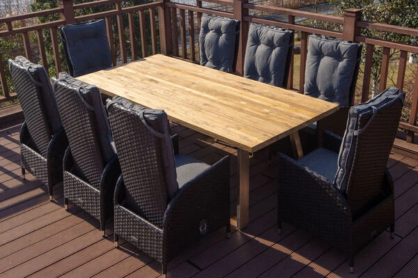 Der Esstisch überzeugt durch seine stattliche Größe von ca. 220 x 100 x 76 cm und bietet damit ausreichend Platz für 6-8 Personen. Das verwendete recycelte Teakholz der Tischplatte verleiht dem Tisch einen ganz besonderen Charme. Die rustikal gebürstete Oberfläche sorgt dafür, dass die natürliche Struktur des Holzes erhalten bleibt und die Maserung besonders gut zum Vorschein kommt. Das Zusammenspiel aus dieser massiven Oberfläche und dem edlen 304er Edelstahl, verleiht dem Tisch sein besonderes Aussehen und sorgt dafür, dass er perfekt zu den Polyrattan-Sesseln passt. Die Stärke der Tischplatte von ca. 4 cm und das besonders geformte Tischgestell unterstreichen das Zusammenspiel aus rustikalen und edlen Elementen zusätzlich.