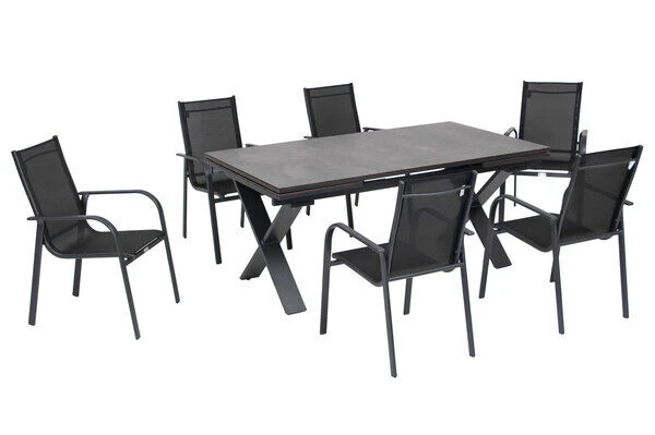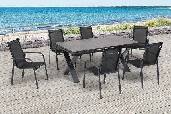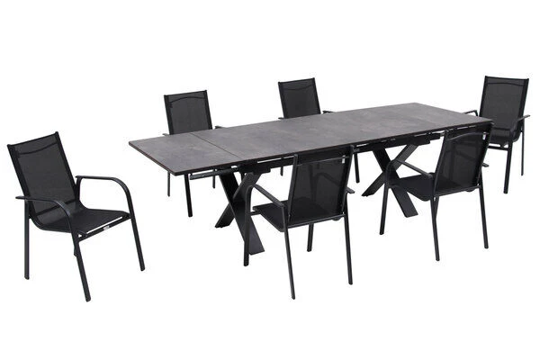 OUTFLEXX® Esstischgarnitur mit Ausziehtisch 180/280x100cm und Stapelsesseln aus Aluminium/HPL/Textilene in schwarz, für 6 Personen