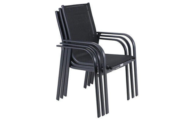 Das Set besteht aus einem Esstisch und 6 dazu harmonierenden Stapelsesseln. Sein modernes Flair fügt sich sowohl im Garten als auch im Haus perfekt ein. Die Sessel sind luftig leicht und doch stabil. Für das solide Gestell kommt korrosionsbeständiges Aluminium zum Einsatz. Die schwungvollen, designstarken Armlehnen sorgen für zusätzlichen Komfort. Bespannt werden die durchgehenden Rücken- und Sitzflächen mit Textilene im passenden Schwarzton. Es ist unglaublich hautsympathisch und sorgt für ein herrliches Sitzgefühl, das Sie auch in der Sommerhitze nicht im Stich lässt. Die Gesamtmaße liegen jeweils bei ca. 67 x 56 x 95 cm. Mit einer Sitzbreite von ca. 41,5 cm und einer Sitztiefe von ca. 43 cm sitzen Sie stets bequem. Dank des schlanken Designs und geringen Gewichtes von ca. 2,8 kg lassen sich die Leichtgewichte auch prima transportieren, stapeln und platzsparend verstauen. Freuen Sie sich darauf nach einem leckeren gemeinsamen Essen oder bei einem Spieleabend den Alltag in weite Ferne rücken zu lassen.