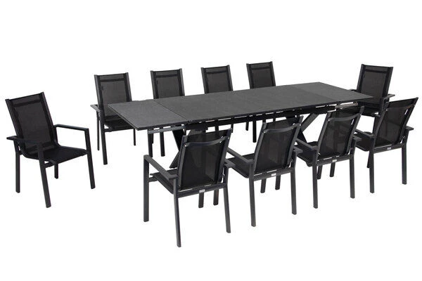 11-teilige Esstischgarnitur von OUTFLEXX® mit Ausziehtisch 180/280x100cm und 10 Stapelsesseln aus Aluminium/Textilene in schwarz
