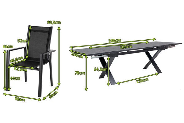 7-teilige Esstischgarnitur von OUTFLEXX® mit Ausziehtisch 180/280x100cm und 6 Stapelsesseln aus Aluminium/Textilene in schwarz