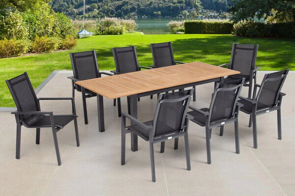 9-teilige Esstischgarnitur von OUTFLEXX® aus Aluminium/Textilene in schwarz, 8 Stapelsessel und Ausziehtisch 152/210x89x74,5cm mit recyceltem FSC®-Teakholz