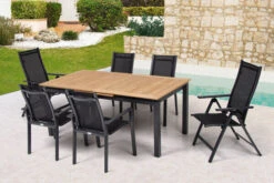 7-teilige Esstischgarnitur von OUTFLEXX® aus Aluminium/Textilene in schwarz, 6 Stapel-/Multipositionssessel und Ausziehtisch 183/243x100x77,5cm mit recyceltem FSC®-Teakholz