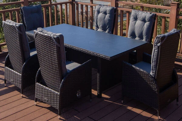 Die gemütlichen Diningsessel sind wahrlich Verwandlungskünstler. Hier können Sie gemütlich mit einem guten Buch in der Sonne liegen oder aber auch ganz bequem Ihr Mittag- oder Abendessen zu sich nehmen. Hierzu brauchen Sie einfach nur Platz zu nehmen und sich Ihren Lieblingssessel problemlos in eine bequeme Liege- oder Sitzposition einstellen. Dies gelingt kinderleicht dank der integrierten Gasdruckfeder – die Rückenlehne kann mit einem kleinen Hebel an der Seite stufenlos verstellt werden. Die Sessel haben ein Gesamtmaß von ca. 65 x 55 x 112 cm. Die Sitzfläche ist ca. 50 cm tief, die Sitzhöhe mit Kissen liegt bei ca. 45,5 cm. Die Armlehnen mit einer Höhe von ca. 66 cm sorgen bei diesen Sesseln für besonderen Komfort.Die Sessel werden je in 2er Sets angeliefert. Die maximale Belastbarkeit pro Sessel liegt bei ca. 135 kg. Der praktische Diningtisch bietet dank seiner Maße von ca. 200 x 95 x 76,5 cm großzügig Platz für sechs bis acht Personen – so steht einem gemütlichen Mittagessen mit der Familie nichts im Wege. Er wird mit einer ca. 6 mm starken Spraystone Platte geliefert. Spraystone ist ein Kunststoff-Stein-Gemisch, das bei diesem Artikel auf Sicherheitsglas aufgesprüht und anschließend eingebrannt wird. Daraus ergibt sich eine wetter- und kratzfeste sowie pflegeleichte Oberfläche in einer eleganten Natursteinoptik, die sich mit einem milden Reiniger und einem Lappen kinderleicht pflegen lässt.
