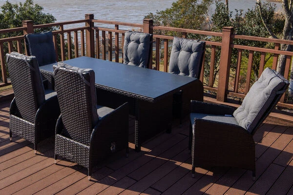 Die Gartenmöbel der Polyrattan-Serie von OUTFLEXX® bieten Ihnen optimalen Komfort für schöne Momente mit Familie und Freunden auf der Terrasse oder im Garten. Das Set besteht aus einem Esstisch und 6 Diningsesseln bezogen mit der Outflexx PremiumLine braun.