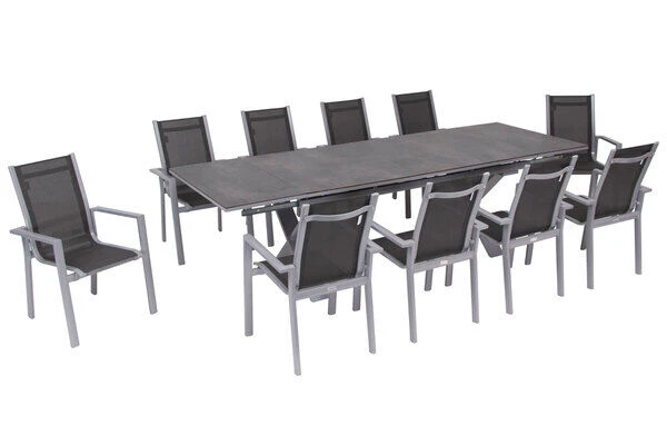 OUTFLEXX® Esstischgarnitur aus Aluminium/Textilene in silber, Ausziehtisch 180/280x100x78cm mit HPL und 10 Stapelsessel