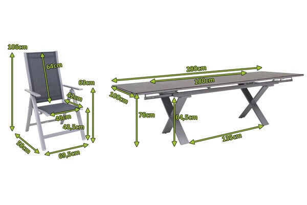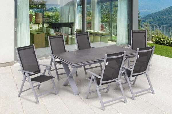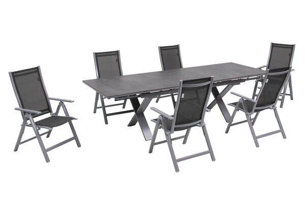 OUTFLEXX® Esstischgarnitur aus Aluminium/Textilene in silber, Ausziehtisch 180/280x100x78cm mit HPL und 6 Multipositionssessel