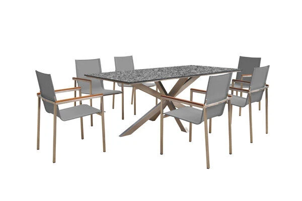 1x OUTFLEXX Esstischgarnitur, silber/anthrazit, Edelstahl/Granit/Textilene, 200×100 cm, 6 Gartensessel, Armlehnen aus FSC-Teak