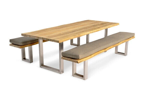 Die natürliche Struktur des Holzes bleibt durch die rustikal gebürstete Oberfläche erhalten und bringt somit die Maserung besonders gut zum Vorschein. Das verwendete Material sowie die hochwertige Verarbeitung sorgen dafür, dass die Esstischgruppe besonders robust und strapazierfähig ist. Mit einem Gewicht von ca. 53,5 kg (Tisch) bzw. 23,9 kg (Bänke) ist die Esstischgarnitur zusätzlich sehr stabil. Das recycelte Teakholz ist sehr witterungsbeständig sowohl gegen Hitze und Frost, als auch Feuchtigkeit und Regen. Teakholz hat einen hohen Anteil an holzeigenen Ölen und somit einen natürlichen Schutz gegen Pilze und andere Schädlinge und das Edelstahl ist rostfrei, dadurch beansprucht die Pflege dieser Esstischgarnitur nur einen minimalen Aufwand Ihrer Zeit. Des Weiteren macht die natürliche Baumkante den Esstisch zu was ganz Besonderem. Das verwendete Material lässt jede Esstischgruppe zu einem Unikat werden.