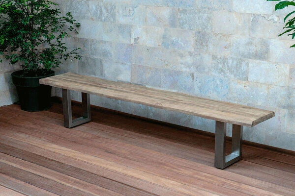 Das Set besteht aus einem Tisch mit den Maßen von ca. 240 x 100 x 76 cm und zwei Bänken mit den Maßen von ca. 240 x 40 x 45 cm. Die Tischplatte sowie die Sitzflächen der Bänke sind aus recyceltem Teakholz gefertigt. Des Weiteren wird die natürliche Baumkante für den Tisch und die Bänke verwendet, wodurch die Esstischgarnitur zu etwas ganz Besonderem wird und zusätzlich die Wertigkeit unterstrichen wird. Für die Gestelle der Esstischgarnitur wurde Edelstahl verwendet. Die Farbkombination aus Silber und naturbelassenem Holz sorgt dafür, dass die Esstischgarnitur zu einem echten Hingucker im zeitlosen Design wird. Die hochwertige Materialkombination aus recyceltem Teakholz und Edelstahl gibt der Esstischgarnitur eine besondere Optik.