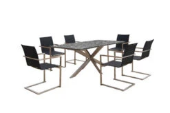 OUTFLEXX Esstischgarnitur, silber/anthrazit, Edelstahl/Granit/Textil, 200×100 cm, 6 Freischwinger, padded, Armlehnen aus FSC-Teak
