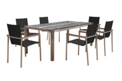 1x OUTFLEXX Esstischgarnitur, silber/anthrazit, Edelstahl/Granit/Textil, 200×100 cm, 6 Gartensessel, Teakarmlehnen