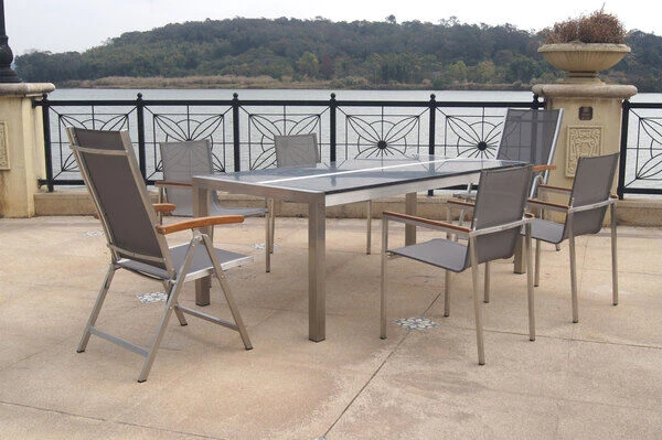 OUTFLEXX Esstischgarnitur, silber/anthrazit, Edelstahl/Granit/Textil, 200×100 cm, 4 Stapelsessel, 2 Multipos, Armlehnen aus FSC-Teak