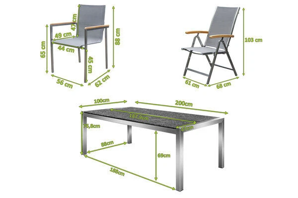 1x OUTFLEXX Esstischgarnitur, silber/anthrazit, Edelstahl/Granit/Textil, 200×100 cm, 4 Stapelsessel, 2 Multipos, Armlehnen aus FSC-Teak