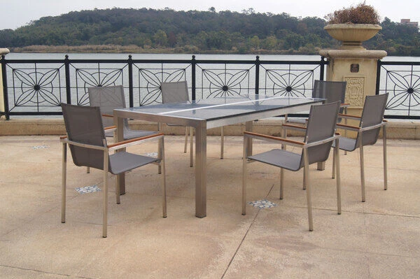 OUTFLEXX Esstischgarnitur, silber/anthrazit, Edelstahl/Granit/Textil, 200×100 cm, 6 Stapelsessel, Teakarmlehnen