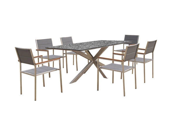 Bei dieser Esstischgruppe treffen hochwertige Materialien und Design auf modernste Weise aufeinander. Das Set besteht aus einem Esstisch mit Granitplatte mit den Maßen von ca. 200×100 cm und 6 Stühlen der Marke OUTFLEXX®.