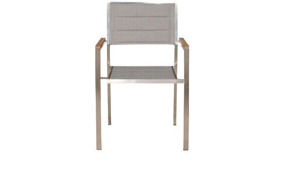 Dieser zeitlose Stuhl besitzt eine Bespannung aus hochwertigem Textilen hergestellt aus 70% Polyvinylchlorid und 30% Polyester. Das witterungsbeständige Material ist durch seine Flexibilität und seine zusätzliche Polsterung (padded)auch ohne Auflagen sehr bequem. Das formstabile Gewebe nimmt kein Wasser auf, ist atmungsaktiv und trocknet nach einem kurzen Schauer sehr schnell. Das sorgfältig verarbeitete Gestell aus rostfreiem 304er Edelstahl ist ebenfalls besonders witterungsbeständig und hält wie die anderen Materialien dieses Stuhls sowohl Frost und Hitze als auch Feuchtigkeit und Regen aus. Das für die Armlehnen verwendete Teakholz ist FSC-zertifiziert und stammt damit aus verantwortungsvollen Quellen. So können Sie sich guten Gewissens zurücklehnen und sich so richtig entspannen. Die hochwertigen Materialien und die sorgfältige Verarbeitung sorgen nicht nur für die besondere Optik dieses Stuhls, sondern machen ihn mit einer Belastbarkeit von ca. 150 kg sehr stabil. Dank der schwarzen Kunststoffkappen an den Stuhlbeinen ist Ihr Boden geschützt. Nachdem die Gäste sich auf den Weg gemacht haben, können Sie die Stühle einfach stapeln und damit platzsparend verstauen.