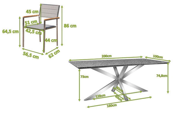 OUTFLEXX Esstischgarnitur, silber/anthrazit, Edelstahl/Granit/Textil, 200×100 cm, 6 Stühle, padded, Armlehnen aus FSC-Teak