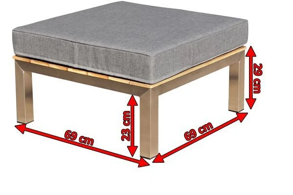 Das Gestell des eindrucksvollen Hockers wurde aus gebürstetem Edelstahl in Kombination mit FSC-zertifiziertem Teakholz angefertigt. Edelstahl eignet sich dank zahlreicher Vorteile ideal für die Herstellung von Gartenmöbeln. Das Material ist besonders stabil, witterungsbeständig, pflegeleicht und rostfrei. Das silberfarbene Gestell wird mit einer Sitzfläche aus FSC-zertifiziertem Teakholz kombiniert. Teakholz ist eine der beliebtesten Holzarten und überzeugt mit einer hohen Witterungsbeständigkeit und Haltbarkeit. Zusätzlich ist es extrem wasserabweisend. Die FSC-Zertifizierung garantiert Ihnen, dass dieses Möbelstück aus verantwortungsvollen Quellen stammt, sodass Sie sich guten Gewissens zurücklehnen und Ihre neuen Gartenmöbel so richtig genießen können. Das Sitzpolster wurde aus Olefin in der Farbe grau angefertigt und bieten Ihnen den perfekten Sitzkomfort. Olefin besteht aus starken, strapazierfähigen Fasern. Die Fasern weisen eine geringe Feuchtigkeitsaufnahme auf, sodass Sie sich auch nach einem kleinen Regenschauer schnell wieder hinsetzen können. Zusätzlich ist das Material widerstandsfähig gegen Schmutz, Abnutzung, Flecken und Chemikalien.