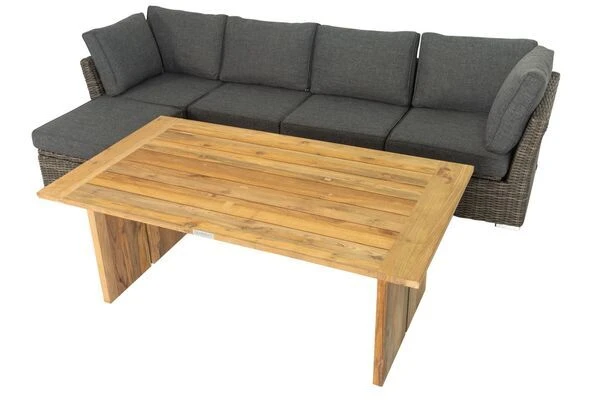 Die gemütliche Loungegruppe besteht aus fünf Einzelteilen, die Sie beliebig anordnen können. Mit im Lieferumfang enthalten ist zusätzlich ein Loungetisch mit den Maßen von ca. 160 x 90 x 62 cm, welcher komplett aus recyceltem Teakholz gefertigt ist und die Lounge farblich perfekt ergänzt. Die rustikal gebürstete Oberfläche sorgt dafür, dass die natürliche Struktur des Holzes erhalten bleibt und die Maserung besonders gut zum Vorschein kommt. Mit den Maßen von ca. 160 x 90 cm bietet er ausreichend Platz für Snacks und Getränke. So können Sie mit Ihrer Familie gemütlich auf Ihrer Lounge zusammenkommen und entspannte Stunden in Ihrem Garten verbringen. Die ca. 3 cm dicke Tischplatte und das extra dicke Tischgestell mit einer Stärke von ca. 4 cm sorgen hier für eine ganz besondere Optik.