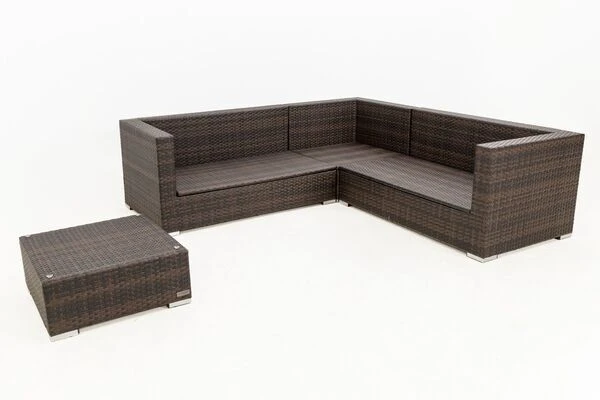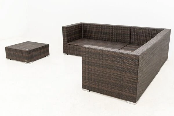 Diese gemütliche Loungegruppe besteht aus 4 Modulen, die Sie beliebig anordnen können. Sie bestimmen somit selbst, wie sich die Möbel auf Ihrer Terrasse am besten präsentieren. Ihre neuen Gartenmöbel sind äußerst pflegeleicht und strapazierfähig, da die verwendete flache Faser sowohl Hitze und Frost als auch UV-Strahlen, Salzwasser und Chlor unbeschadet hinnimmt und nichts von ihrer ursprünglichen Schönheit einbüßt. Im Inneren befindet sich ein rostfreies Aluminiumgestell, welches für die nötige Stabilität sorgt und aufgrund des geringen Gewichts einen einfachen Platzwechsel ermöglicht. Der 1-Sitzer ist mit bis zu ca. 150 kg belastbar, beim 2-Sitzer Sofa sind es sogar ca. 300 kg. Alle Module verfügen über edle Aluminiumfüße, die dank der Kunststoffnoppen Ihren Bodenbelag schonen und einen schönen Kontrast zur Polyrattanfaser bilden.