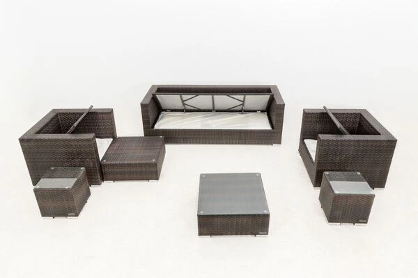 Diese gemütliche Loungegruppe besteht aus 7 Modulen, die Sie beliebig anordnen können. Sie bestimmen somit selbst, wie sich die Möbel auf Ihrer Terrasse am besten präsentieren. Ihre neuen Gartenmöbel sind äußerst pflegeleicht und strapazierfähig, da die verwendete flache Faser sowohl Hitze und Frost als auch UV-Strahlen, Salzwasser und Chlor unbeschadet hinnimmt und nichts von ihrer ursprünglichen Schönheit einbüßt. Im Inneren befindet sich ein rostfreies Aluminiumgestell, welches für die nötige Stabilität sorgt und aufgrund des geringen Gewichts einen einfachen Platzwechsel ermöglicht. Alle Module verfügen über edle Aluminiumfüße, die dank der Kunststoffnoppen Ihren Bodenbelag schonen und einen schönen Kontrast zur Polyrattanfaser bilden. Der Sessel ist mit bis zu ca. 150 kg belastbar, beim 3-Sitzer Sofa sind es sogar ca. 450 kg.