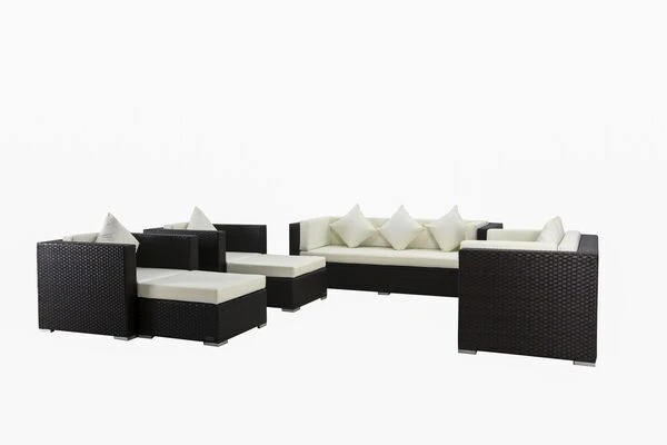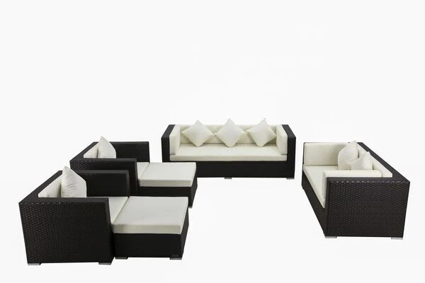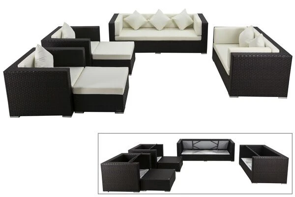 Das Lounge-Set in Braun besteht aus zwei mit Polstern ausgestatteten Polyrattan Sesseln, einem 3-Sitzer Sofa, einem 2-Sitzer Sofa sowie zwei Hocker, die Sie aufgrund der mitgelieferten Sicherheitsglasplatten ganz einfach und schnell in Tische umfunktionieren können. Dieses Set bietet Ihnen also alles, was Sie für einen schönen Sommer im Garten benötigen.