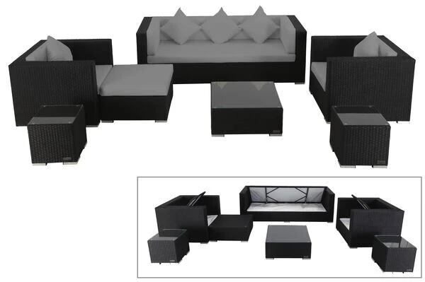 Edel und schön: OUTFLEXX® Polyrattan Loungegruppe inkl. Kaffeetisch mit Kissenboxfunktion in Schwarz für 6 Personen