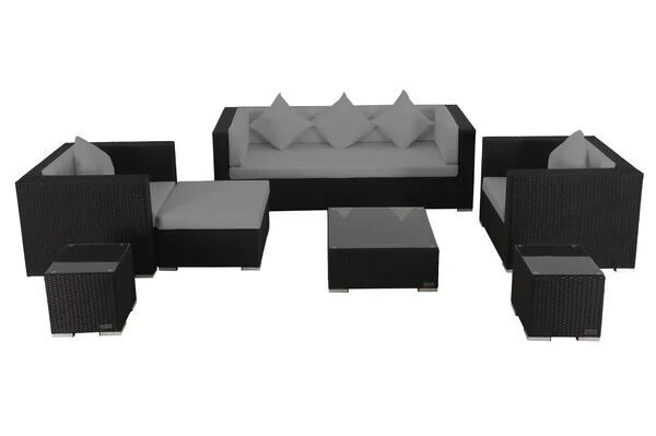 Das Loungemöbel-Set besteht aus zwei Sesseln, einem 3-Sitzer-Sofa, zwei kleinen Beistelltischen sowie einem Hocker und einem Kaffeetisch mit je einem Sitzpolster und einer Sicherheitsglasplatte.