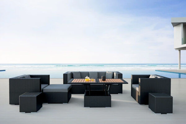 Das Loungemöbel-Set besteht aus zwei Sesseln, einem 3-Sitzer-Sofa, zwei kleinen Beistelltischen, einem höhenverstellbaren Loungetisch sowie einem Hocker mit einem Sitzpolster und einer Sicherheitsglasplatte. Was den höhenverstellbaren Loungetisch so besonders macht, ist seine Vielseitigkeit, denn er ist nicht nur als Loungetisch nutzbar, sondern lässt sich bei Bedarf mit einem einfachen Mechanismus in einen Esstisch verwandeln. Der Tisch passt sich somit ideal Ihren persönlichen Bedürfnissen an. Dieses Set bietet Ihnen also alles, was Sie für einen entspannten Sommer benötigen und wird garantiert der neue Blickfang in Ihrem Garten oder auf der Terrasse.