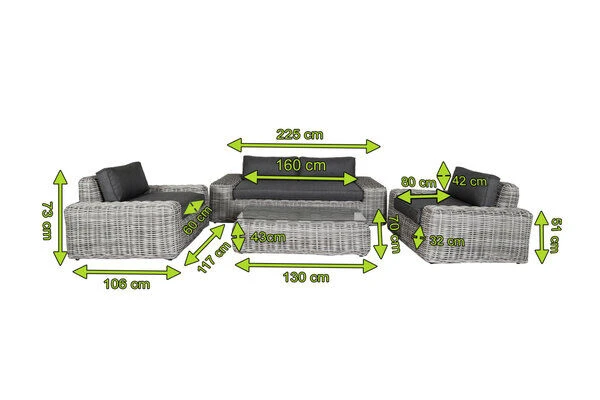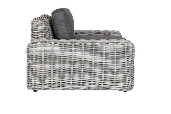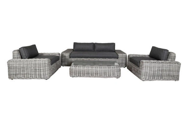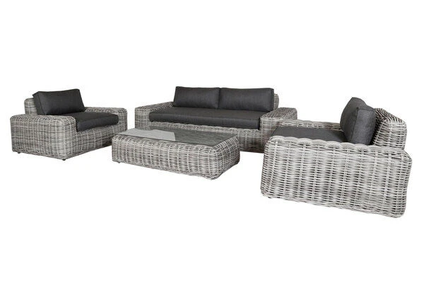 Polyrattan – ein zeitloser Klassiker – Die hier verwendeten Polyrattan Fasern in white faded grey bringen neue Farbe in Ihren Garten. Kombiniert mit den Kissenbezügen in Anthrazit harmonieren sie perfekt. Als zeitloser Klassiker wird Polyrattan Ihren Ansprüchen an Qualität in allen Belangen gerecht. Polyrattan ist strapazierfähig, pflegeleicht und witterungsbeständig, so dass diese Loungegarnitur problemlos das ganze Jahr über im Freien stehen kann.